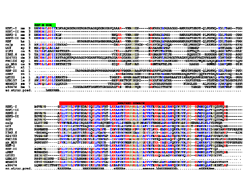 | Figure 2: REF: an evolutionarily conserved family of hnRNP-like proteins. Multiple alignment of members of the REF-family of proteins. First column: protein names; second column: species names (bm: Bombyx mori; ce: Caenorhabditis elegans; dm: Drosophila melanogaster; hs: Homo sapiens; le: Lycopersicon esculentum; mm: Mus musculus; rn: Rattus norvegicus; sc: Saccharomyces cerevisae; sm: Schistosoma mansoni; sp: Saccharomyces pombe; xl: Xenopus laevis); third column: start of sequences; right most column: database accession numbers. Conserved charged residues are shown in red; conserved hydrophobic residues are shown in blue; other conserved residues are shown in bold. Dots represent the lack of sequence information while dashes represent gaps in the alignment. This multiple alignment was constructed by ClustalX (Thompson, J. D.et al., 1997) and manually refined by SEAVIEW alignment editor (Galtier et al, 1996). The RRM/RBD-domain and the conserved REF-N and REF-C boxes flanking the RBD-domain are shown in colour above the sequences. The secondary structure prediction by PHD (Rost, B. et al., 1994) is indicated below the sequences (H,h: alpha-helix; E,e: beta-strand). Capital letters indicate prediction with expected average accuary >82%. The sequence data for mREFs 1 (I and II) and 2 (I and II) are available from GenBank/EMBL/DDBJ under accession numbers AJ252140 and AJ252141. |